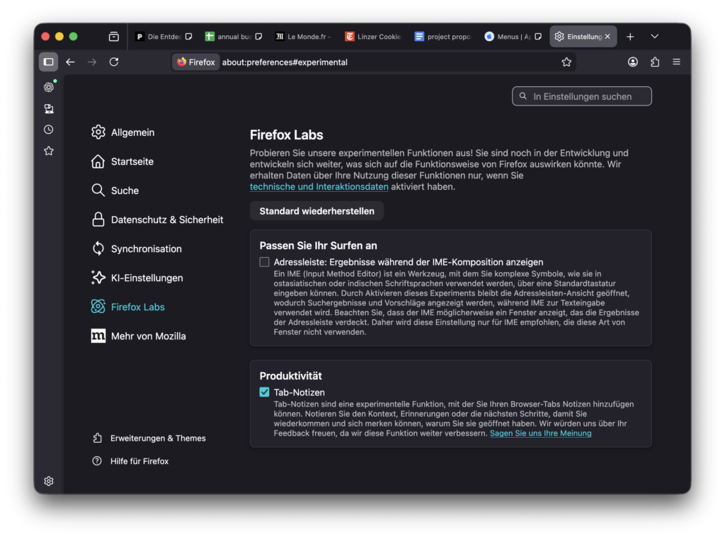 Dieses Experiment steckt in Kinderschuhen und ist Teil des Programms Firefox Labs. Wir würden uns über Feedback freuen. Teile es mit uns auf Mozilla Connect oder erstelle in Bugzilla ein Ticket.