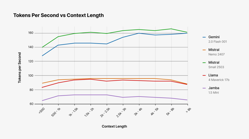 In both of these tests, Mistral-Small and Gemini-2.0-flash are the clear winners. Both models are faster to begin generating output and produce tokens at a much faster clip than the other models we tested.