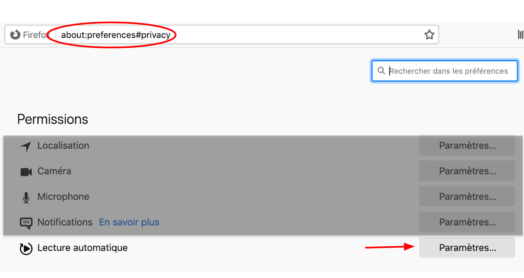 Par défaut, Firefox propose la deuxième option, c’est-à-dire sans le son, mais vous pouvez facilement choisir l’option qui vous convient le mieux. Assurez-vous d’utiliser la dernière version du navigateur puis saisissez about:preferences#privacy dans la barre de recherche et faites défiler l’écran pour faire apparaître les paramètres de lecture automatique dans vos permissions.