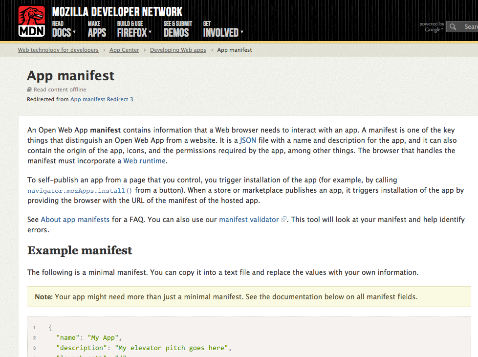 Manifest aplikacji: Manifest otwartej aplikacji sieciowej zawiera informacje niezbędne przeglądarce do interakcji z aplikacją. Manifest ten odróżnia stronę internetową od aplikacji otwartej sieci. Jest to plik JSON zawierający nazwę i specyfikację aplikacji.