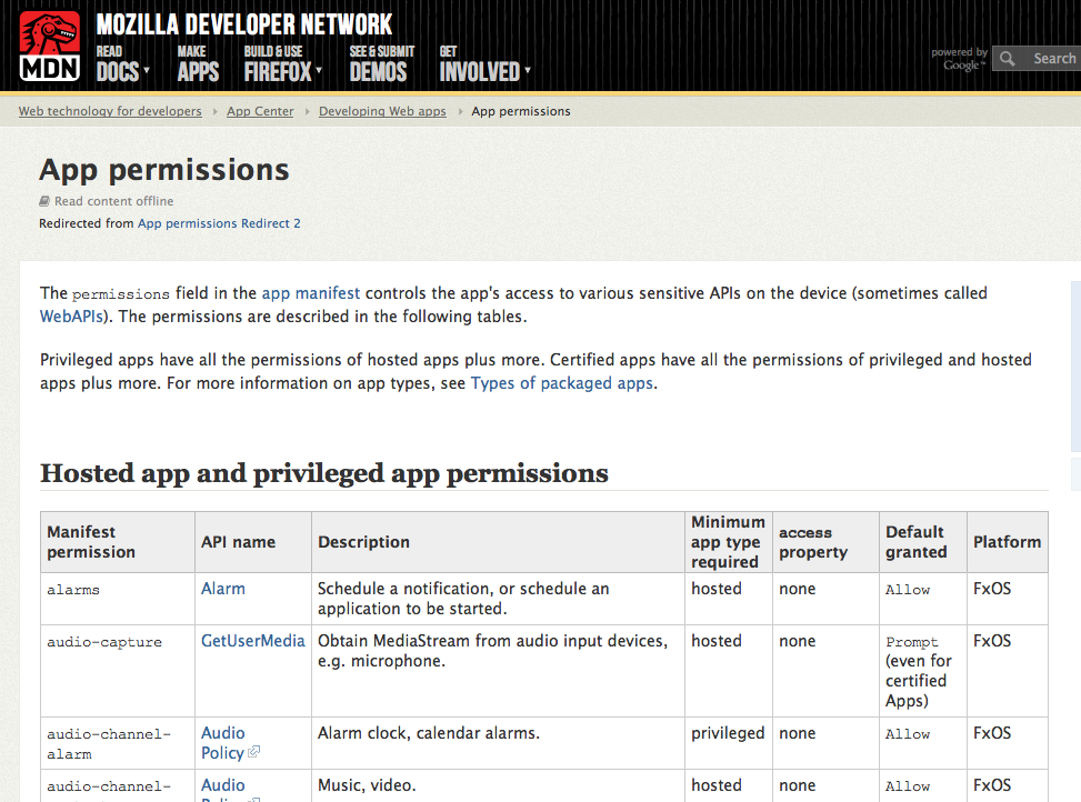 Szczegółowy opis uprawnień aplikacji oraz wymaganych poziomów bezpieczeństwa można znaleźć pod adresem: https://developer.mozilla.org/en-US/docs/Apps/App_permissions
